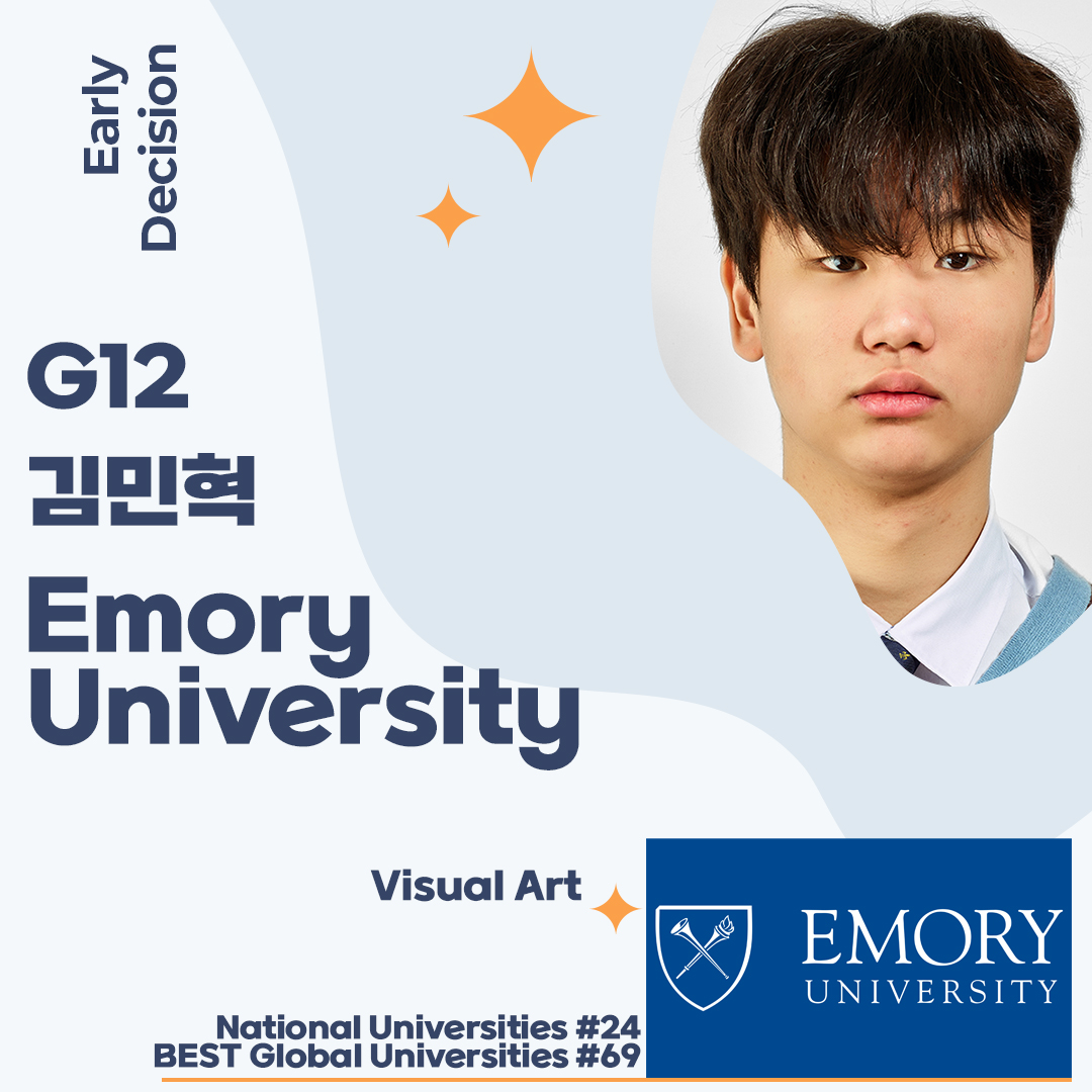 - Emory University 합격 KCIS 김민혁 학생 KCIS G12 김민혁 학생이 미국 명문 사립대학 Emory University에 Early Decision 전형으로 합격하는 기쁜 소식을 전해왔습니다. Emory University는 미국을 대표하는 최상위권 사립대학으로, 높은 학업 수준과 엄격한 선발 과정으로 잘 알려진 대학입니다. (U.S. News & World Report 기준 2026년 National Universities #24, Best Global Universities #69) 특히 Emory University가 학생이 오랫동안 목표로 삼아온 Dream School였다는 점에서, 이번 Early Decision 합격은 더욱 뜻깊은 결과라 할 수 있습니다. 김민혁 학생은 Visual Art 전공으로 합격하였으며, 예술 분야를 중심으로 창작 활동과 관련된 경험을 꾸준히 이어오고 있으며, 현재는 Art Club 리더로 활동하며 전공과 연계된 학교 공동체 활동에도 적극적으로 참여하고 있습니다. KCIS는 김민혁 학생의 성과를 진심으로 축하하며, 앞으로 Emory University에서 이어갈 새로운 배움과 창작의 여정을 따뜻한 마음으로 응원합니다 :) 26-02-02